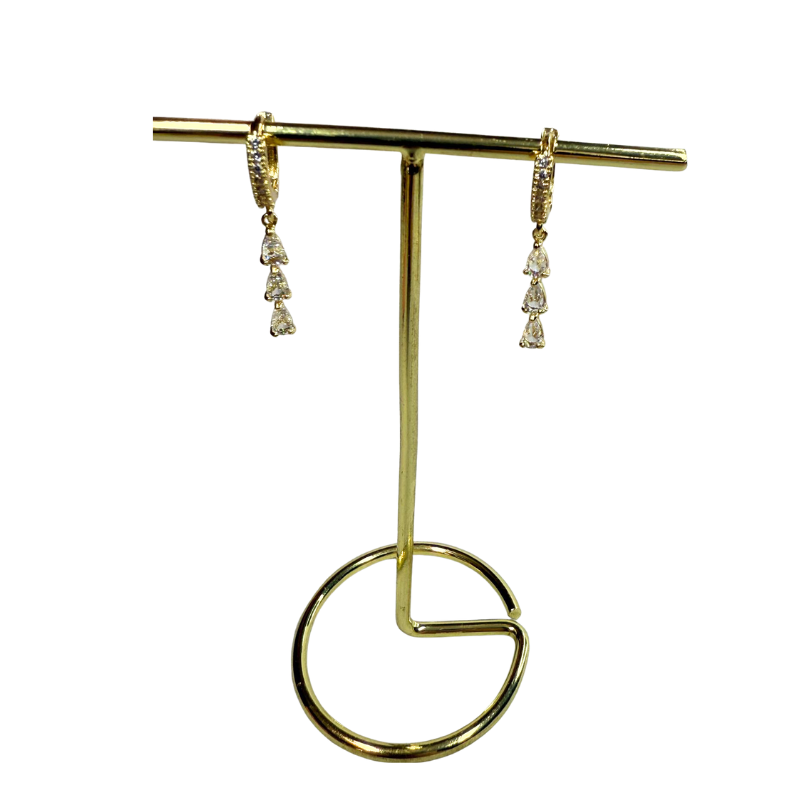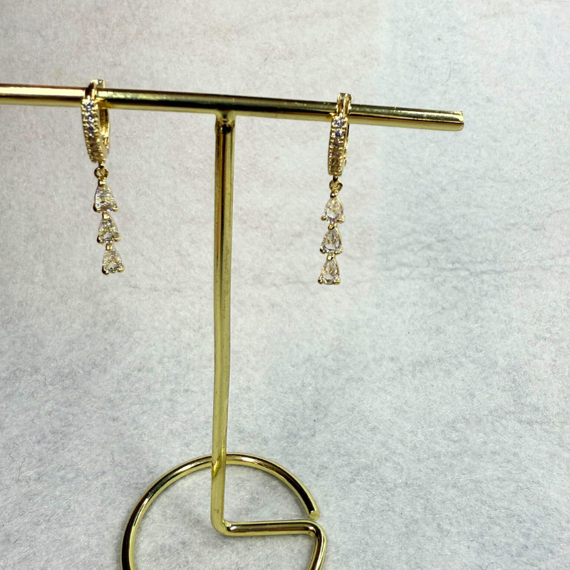 Os Brincos Cascata Dourada apresentam um design elegante e delicado, com três zircónias sintéticas em formato gota dispostas em queda suave. O efeito cascata cria movimento natural e um brilho subtil que acompanha cada gesto, tornando esta peça sofisticada sem ser excessiva.