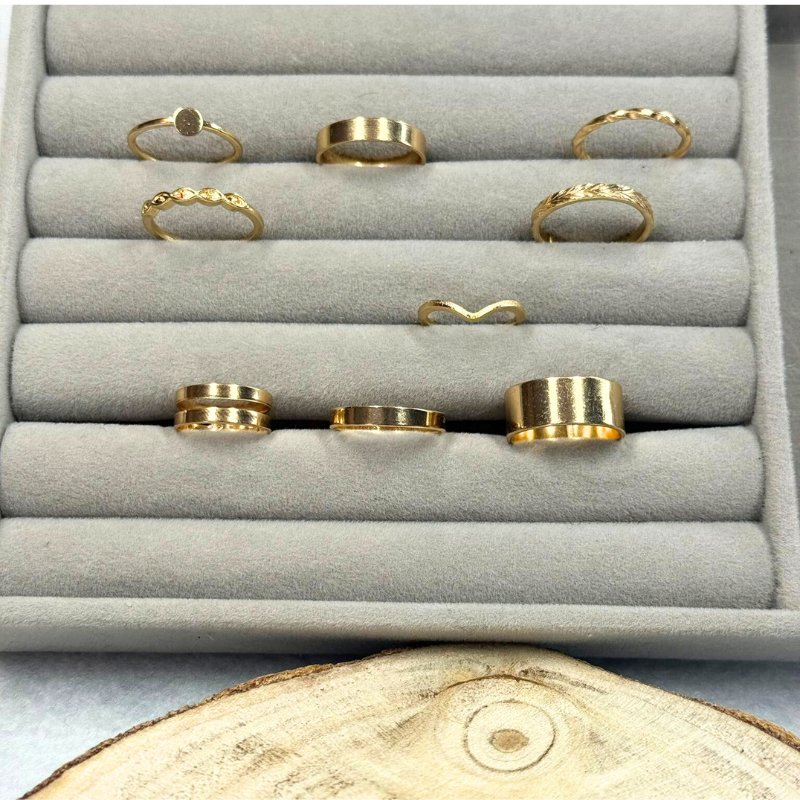 O Conjunto 9 Anéis Chic reúne nove modelos diferentes em banho dourado, pensados para criar combinações modernas, elegantes e versáteis. O conjunto inclui anéis minimalistas, texturizados, delicados, lisos e ajustáveis, permitindo criar várias composições conforme o estilo e a ocasião. A variedade de formas e acabamentos oferece liberdade total para misturar, sobrepor ou usar individualmente, tornando o conjunto uma escolha prática para quem gosta de variar acessórios.