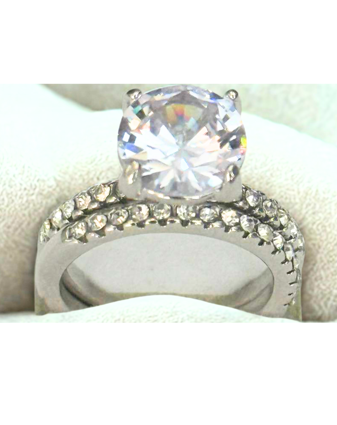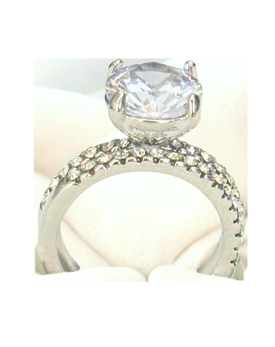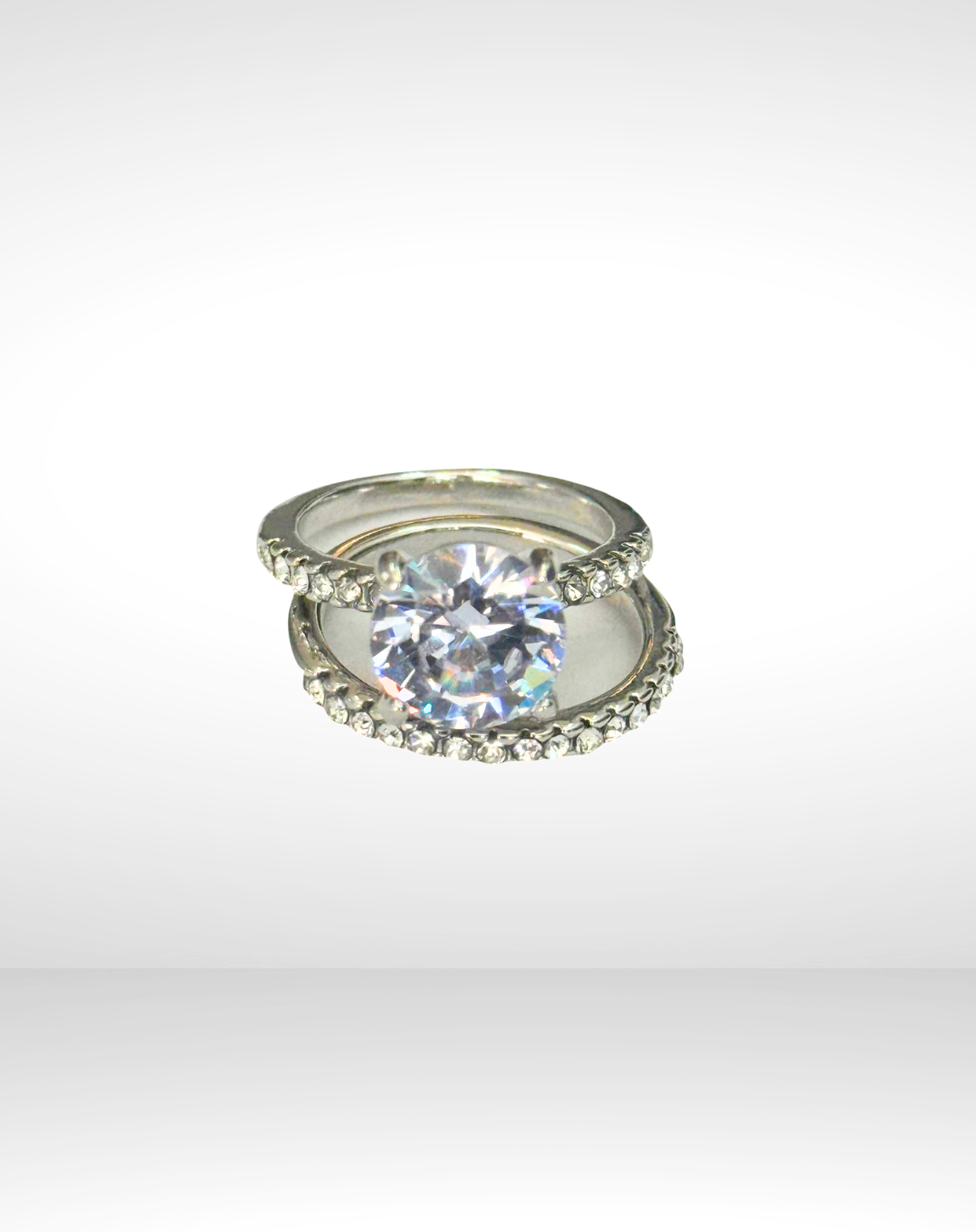 Solitário de proporção generosa + aliança pavê combinados para efeito de anel duplo; zircônias sintéticas com lapidação que prioriza brilho, tudo em banho de prata com acabamento polido.