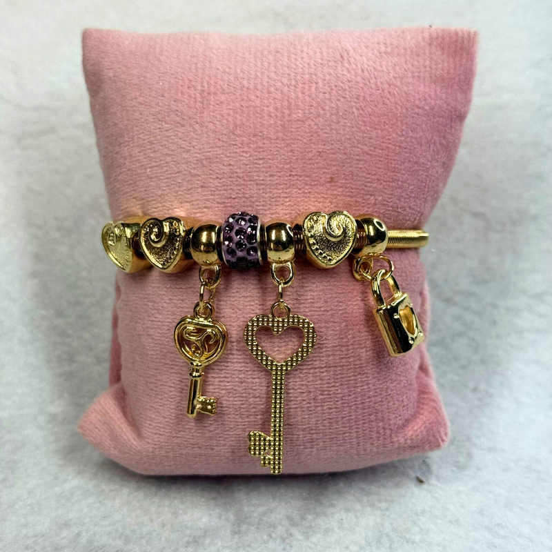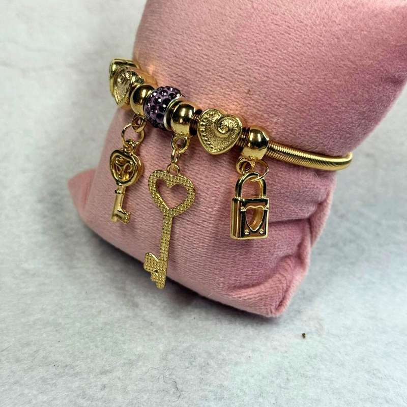 A Pulseira Chave do Amor é uma peça em aço inox ajustável que combina resistência, brilho e um conjunto de pingentes cuidadosamente selecionados para criar um visual marcante e elegante. O design inclui sete pingentes dourados, entre eles coração, cadeado e chave — símbolos associados a carinho, proteção e ligação emocional. O toque de cor fica por conta do mosaico de strass lilás, que acrescenta luminosidade discreta e moderna ao conjunto.