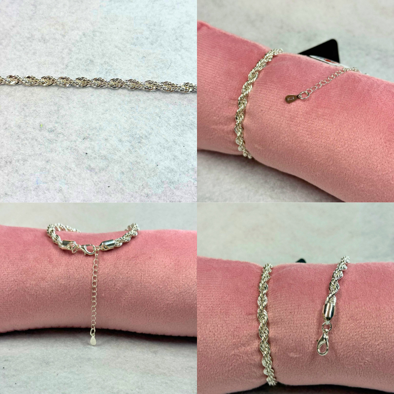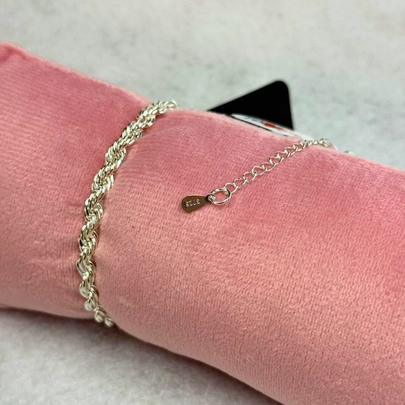 A Pulseira Trança Prata apresenta um design clássico e elegante, com elos entrelaçados que criam um efeito torcido sofisticado e intemporal. O acabamento polido realça o brilho da prata, tornando esta peça versátil e fácil de combinar com diferentes estilos e ocasiões.